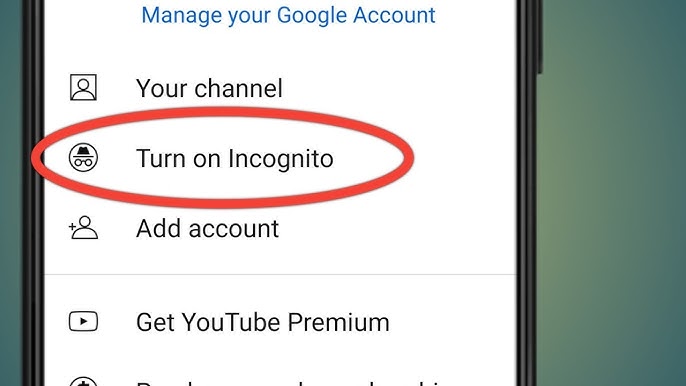 - Under your profile photo, swipe left (where you can see “Change account”, “Google account”, “Turn on incognito browsing”, “Share channel” )
