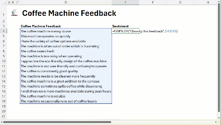 - Classify data: e.g =COPILOT(“Classify this feedback”, D4:D18)